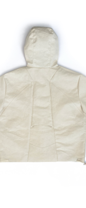 A two-year design research explores aircraft as structures with smooth exteriors acting as protective shells and interiors designed for comfort and movement. This logic was translated into garments through material and design choices: a Schoeller jacket shell, Cordura adjustment components, and a custom 3D-printed titanium button inspired by aircraft structure.